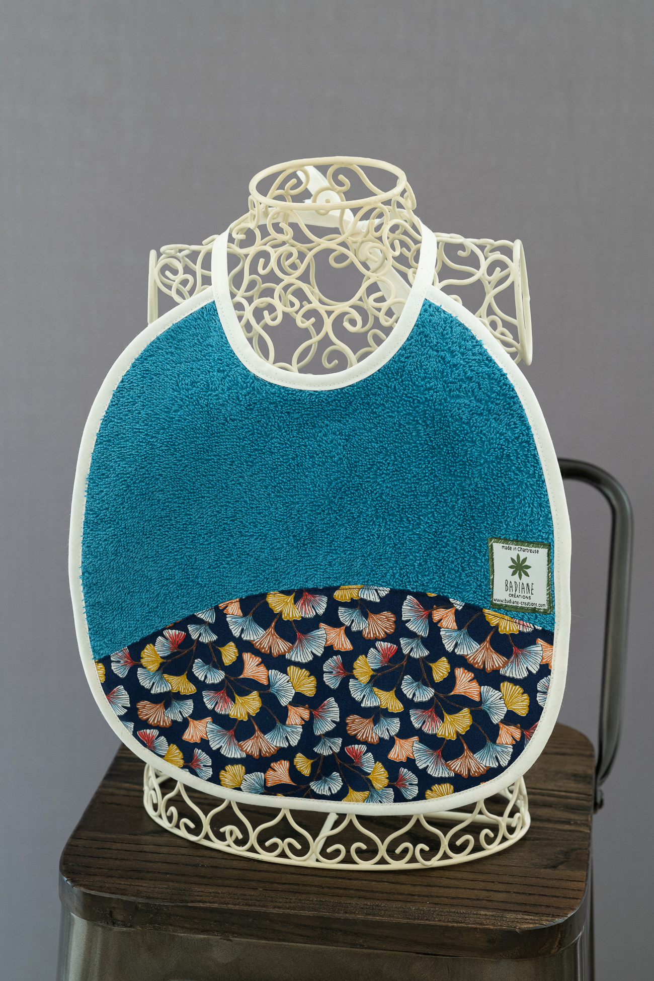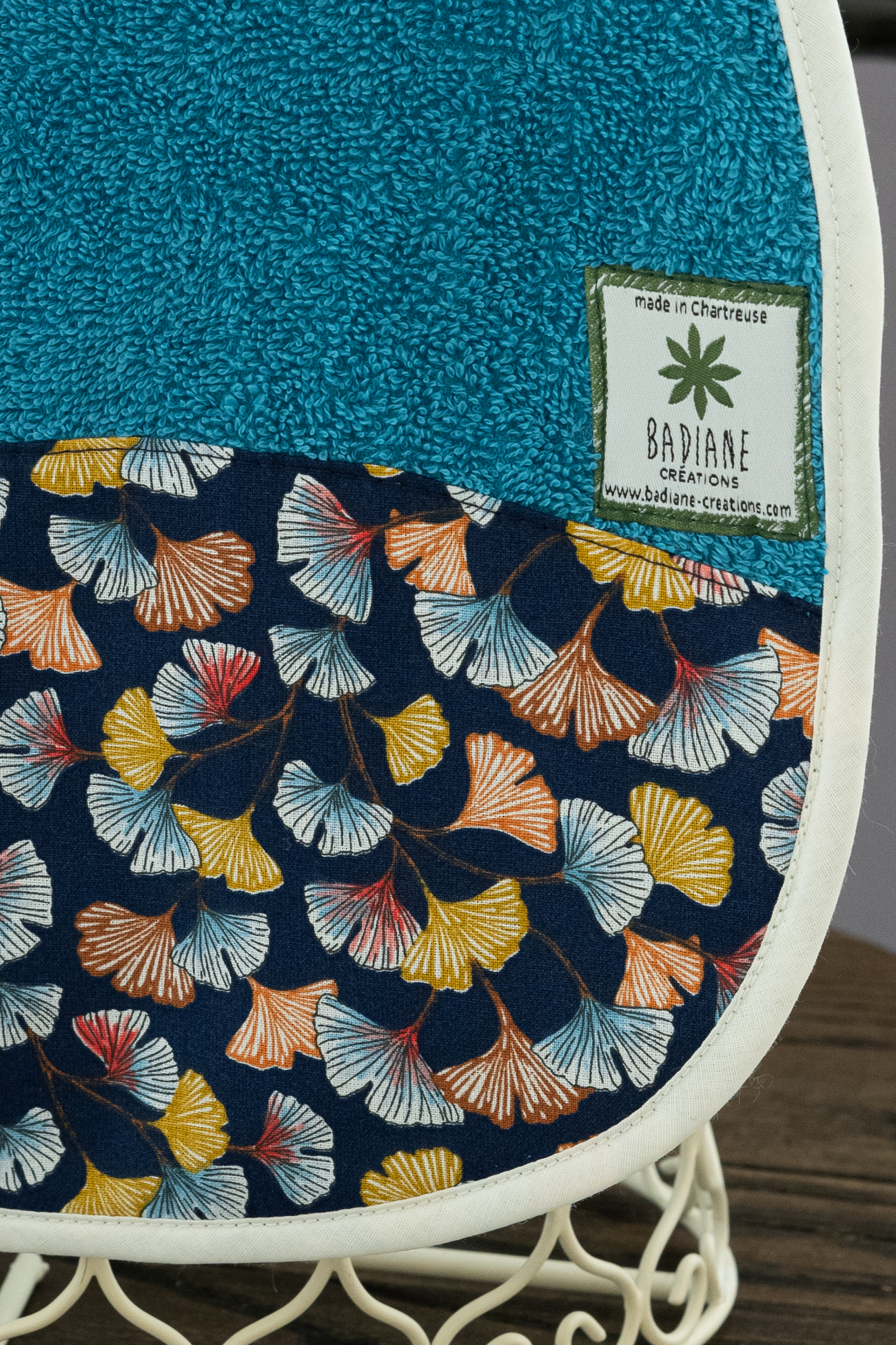 Ici, éponge turquoise, biais écru et tissu motifs fleurs de ginkgo .. sur fond marine