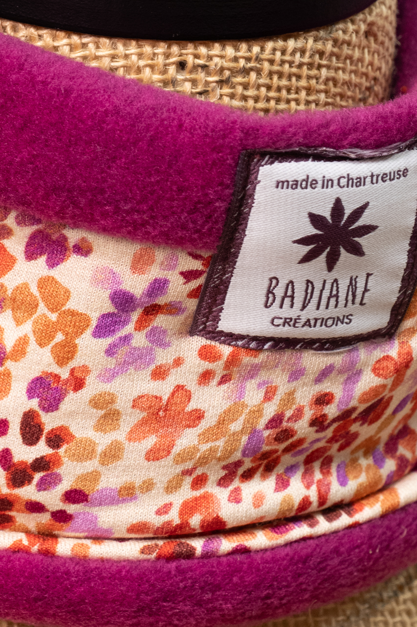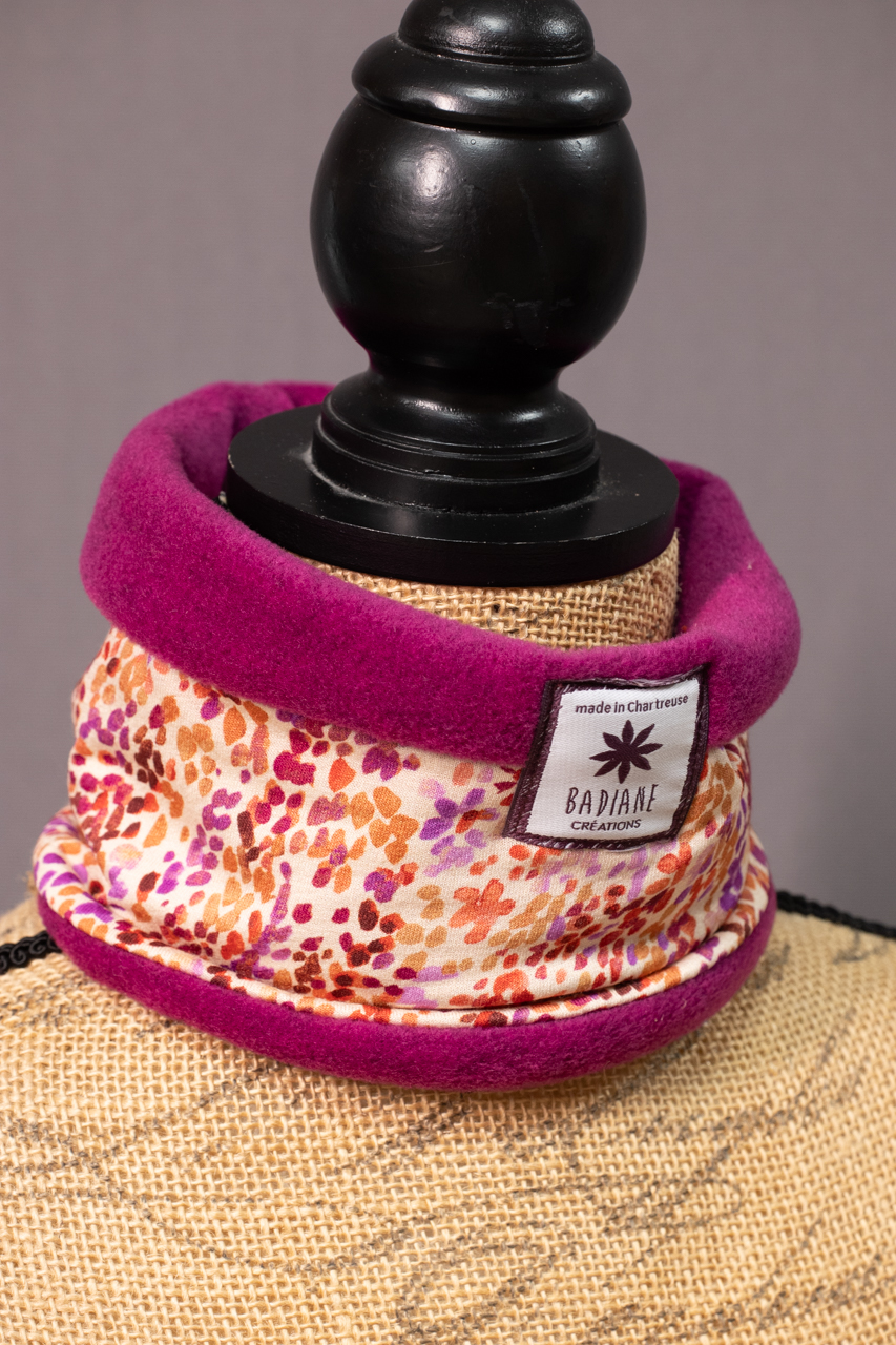 Cache-cou réversible, un coté jersey imprimé plumetis mauve, prune, beige… et l’autre coté uni en polaire chinée fuchsia.