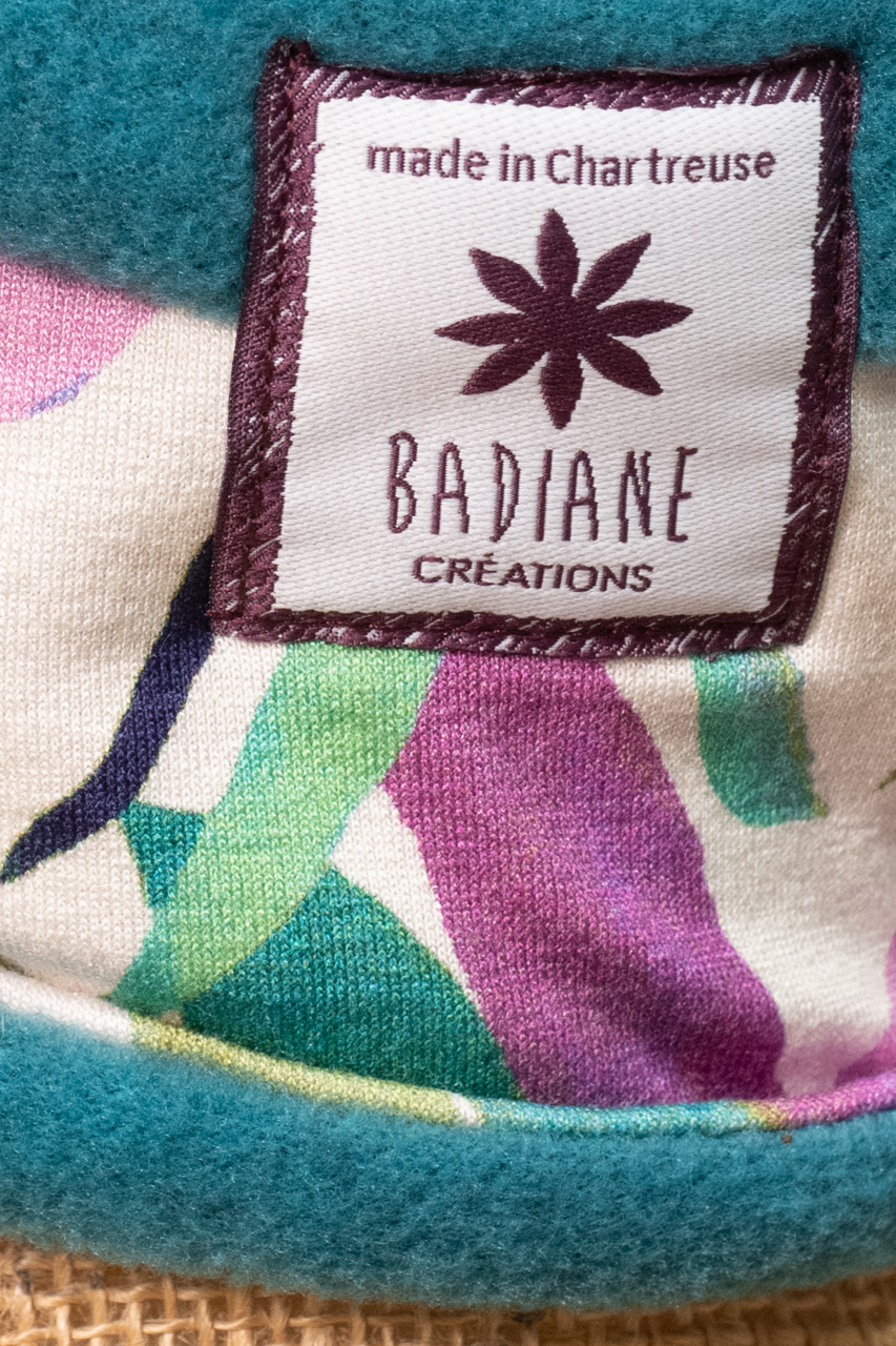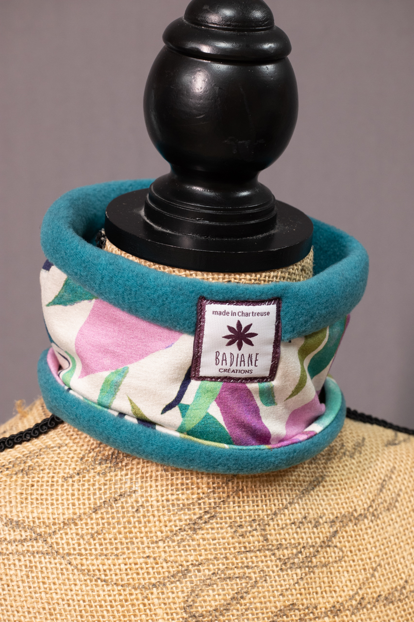 Cache-cou réversible, un coté jersey imprimé fleurs rose, fuchsia, Nil sur fond blanc… et l’autre coté uni en polaire chinée turquoise.