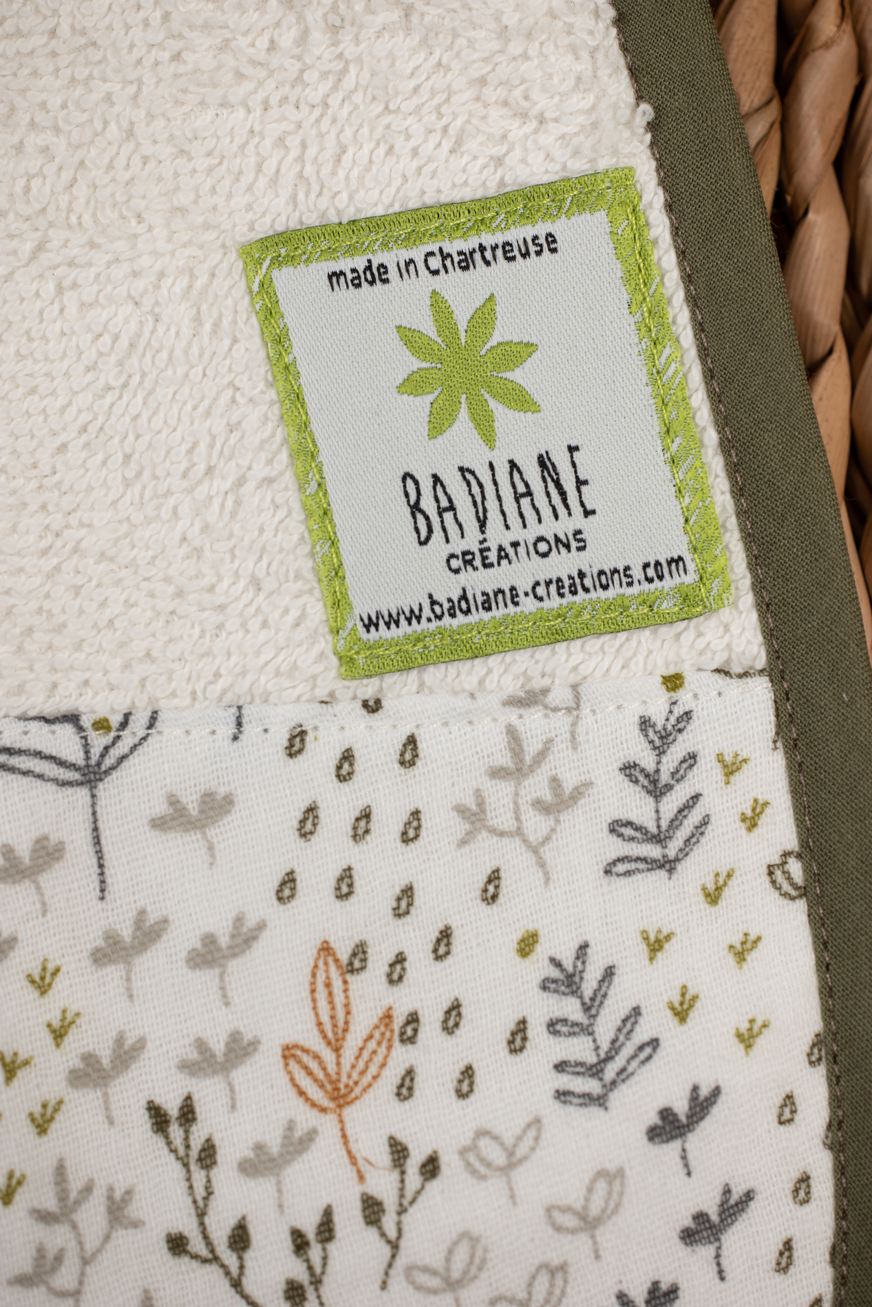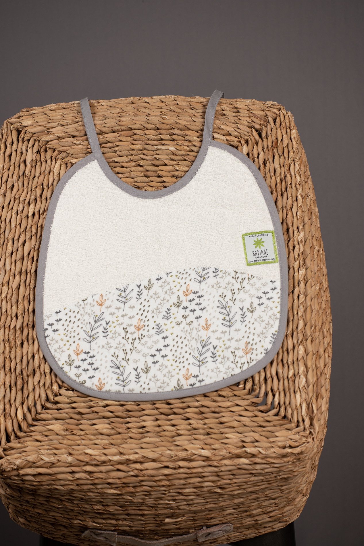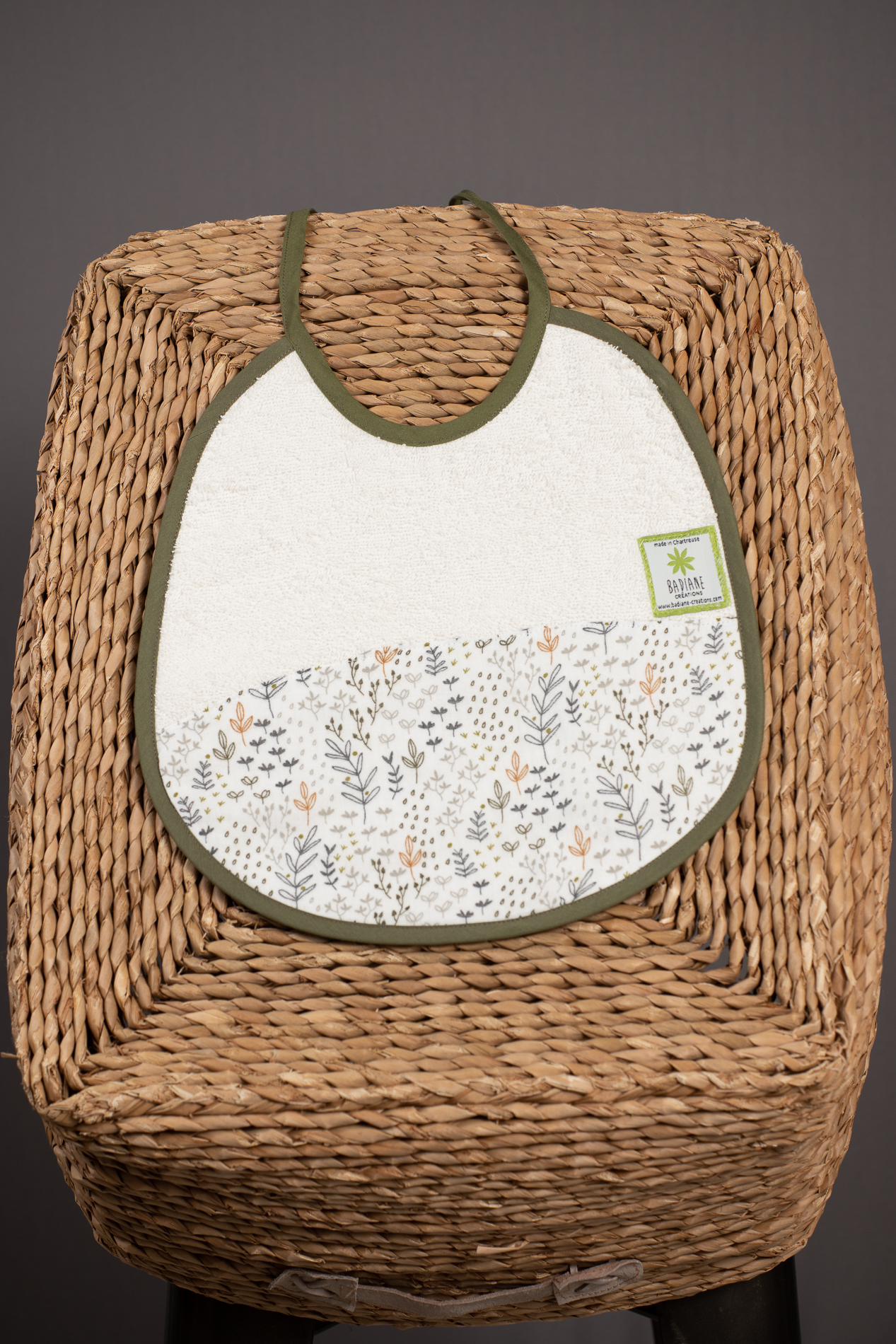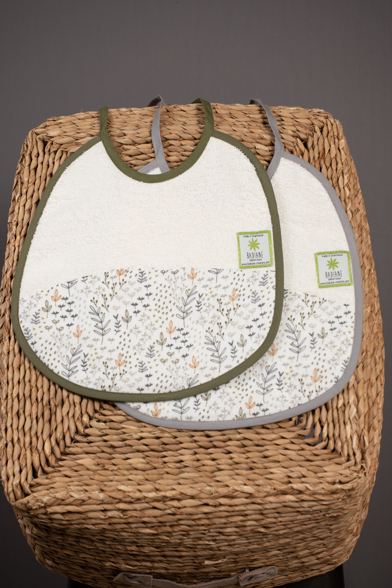 Ici,  bavoirs en éponge écrue. L’un des bavoirs avec un biais kaki  et l’autre avec un biais gris clair et tissu imprimé feuillages.