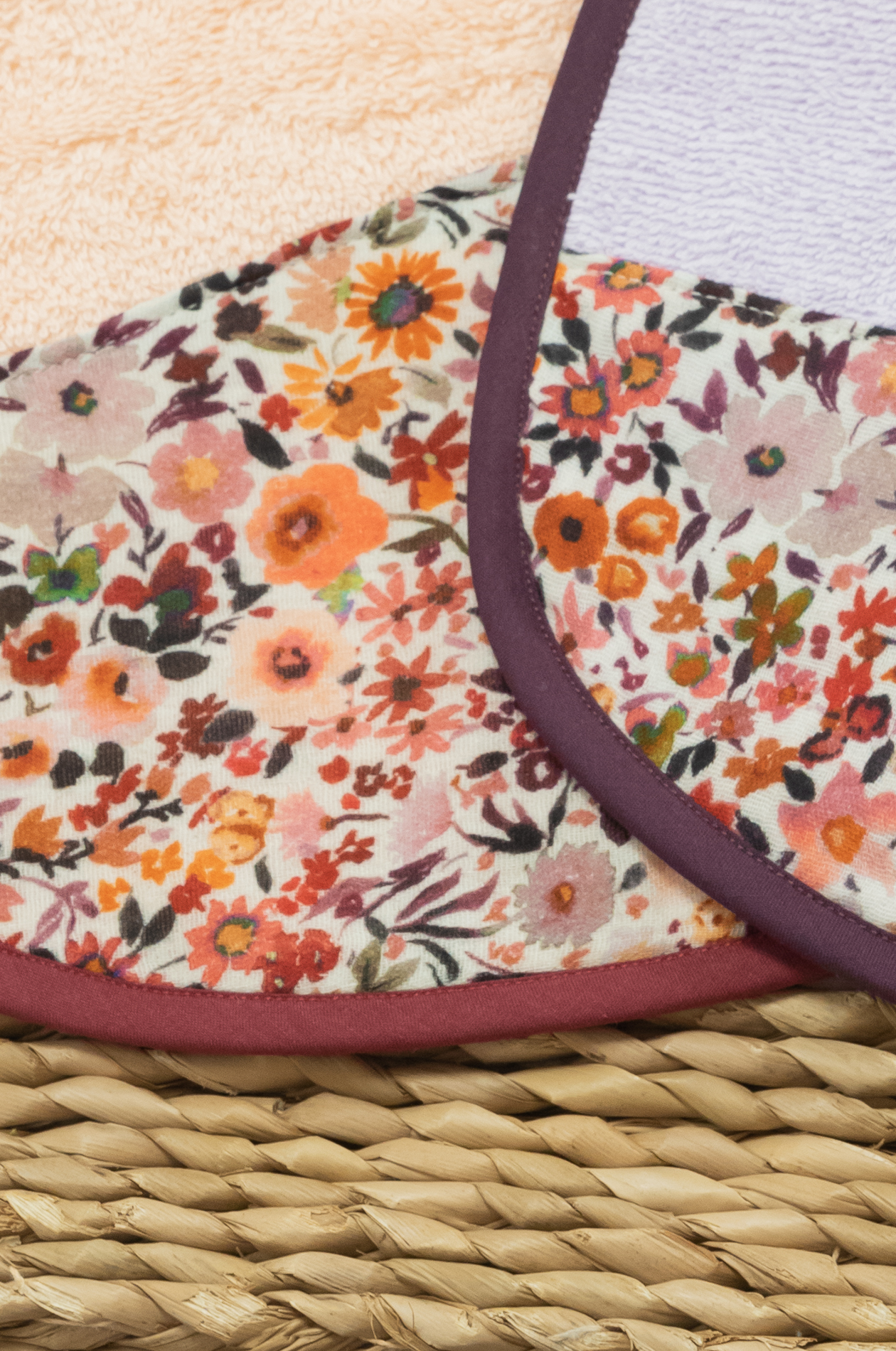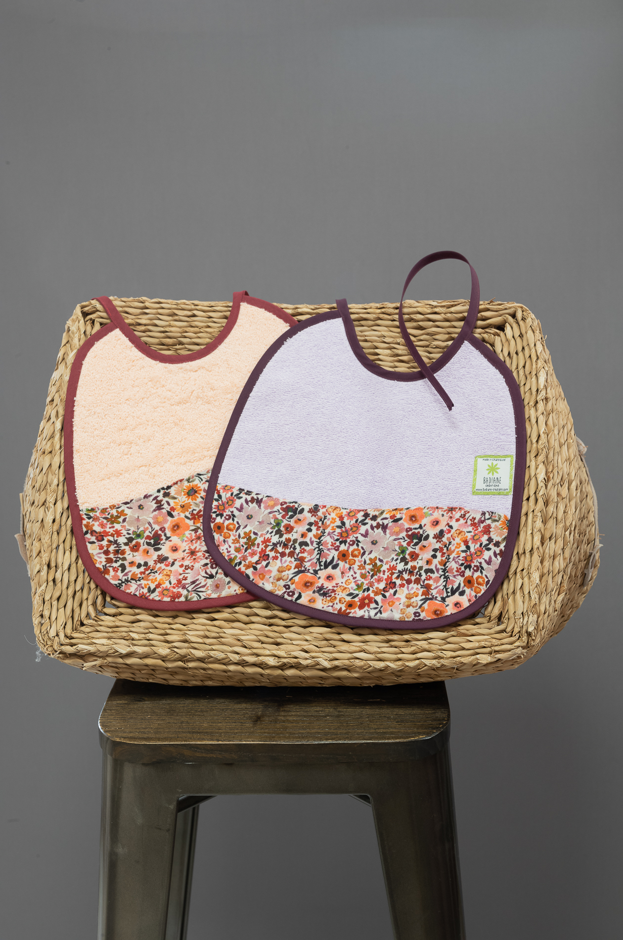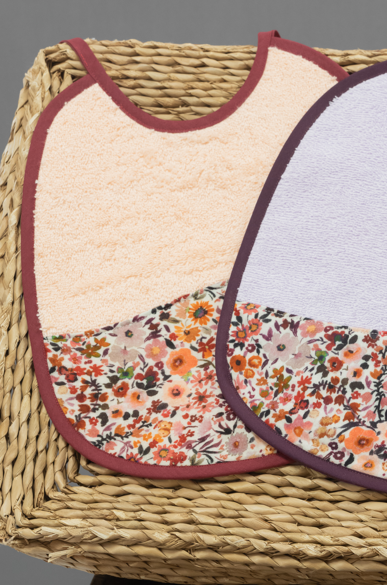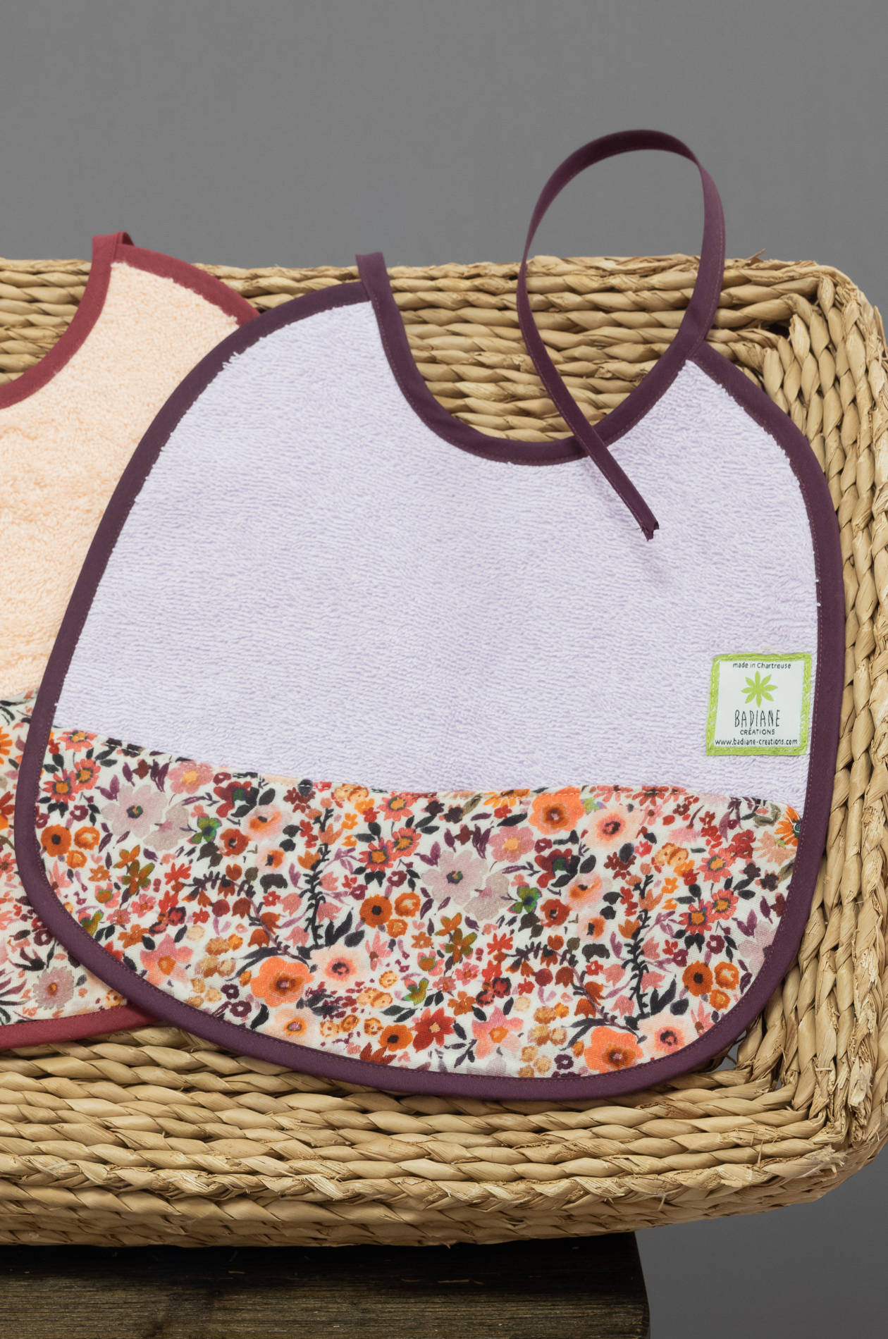 Ici, un des bavoirs en éponge mandarine , biais bordeaux et l’autre en éponge parme, biais myrtille et tissu imprimé fleurs prune, orange, corail, parme… pour les deux bavoirs.