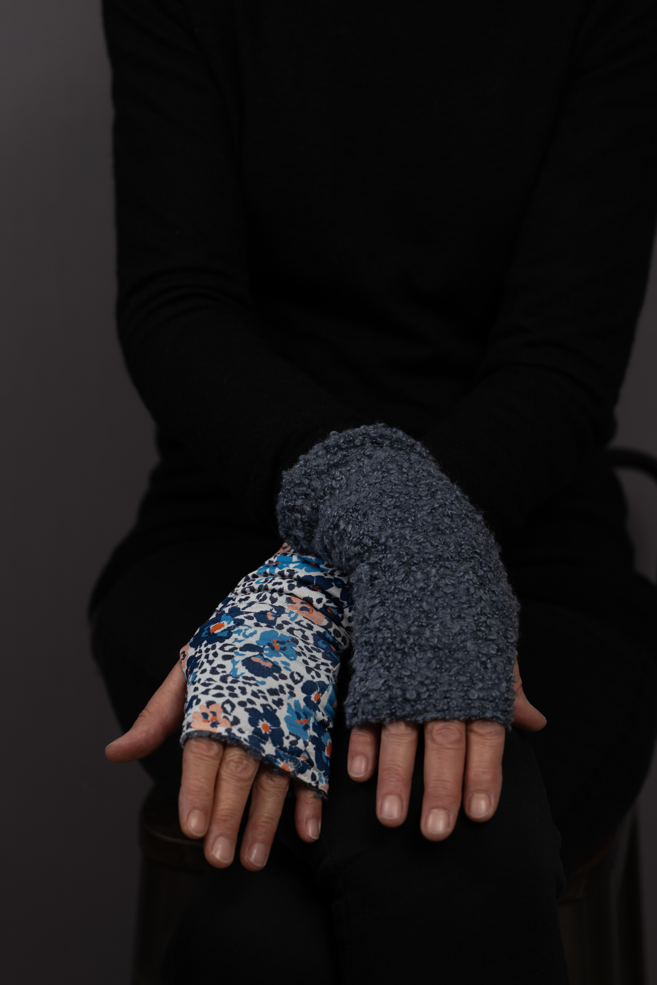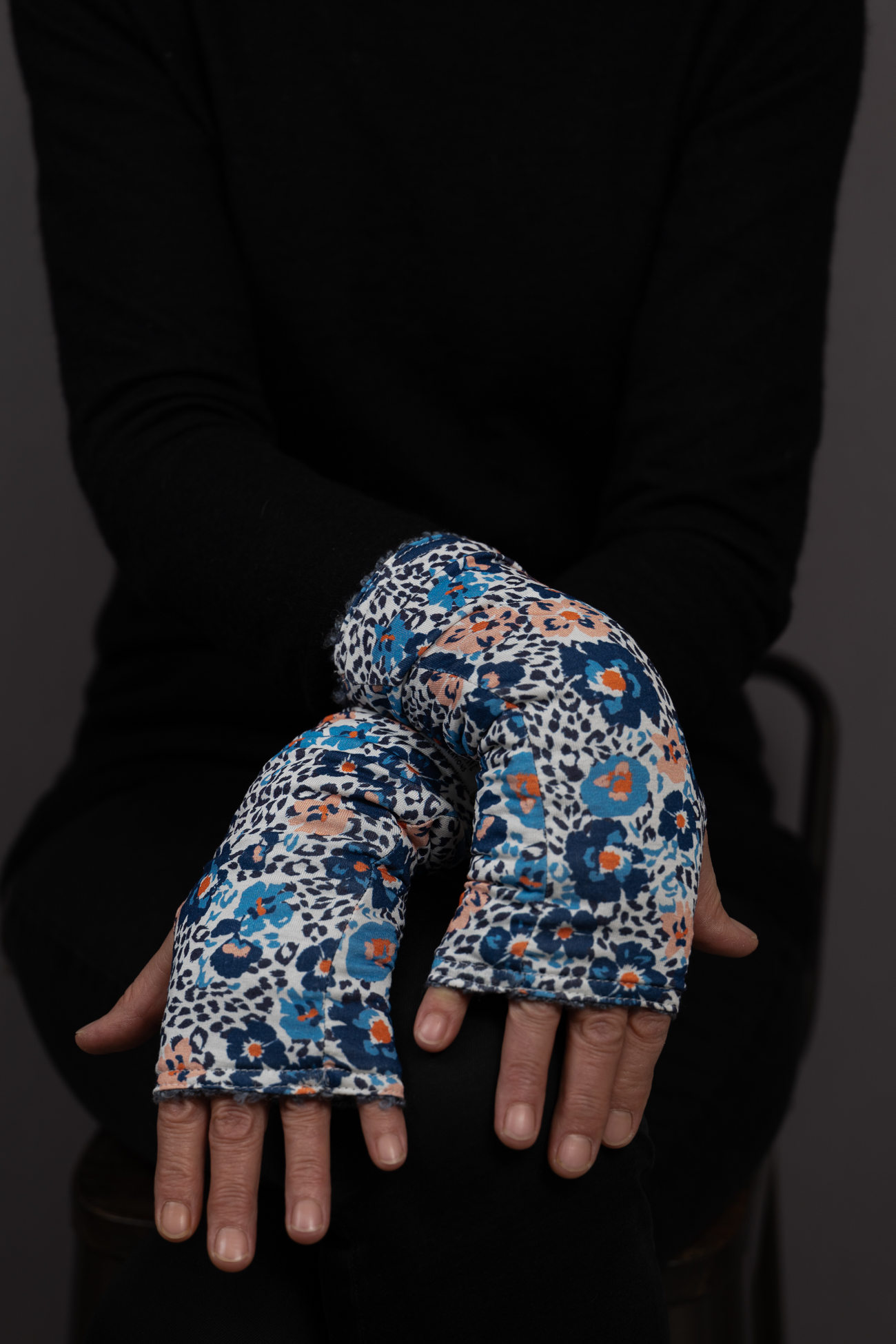 Mitaines réversibles  : côté pile en tissu jersey imprimé fleurs bleues, corail… sur fond blanc.. et côté face en maille bleu.