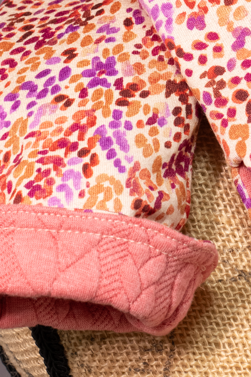 Mitaines réversibles : côté pile en tissu imprimé plumetis et côté face en tissu torsadé corail.