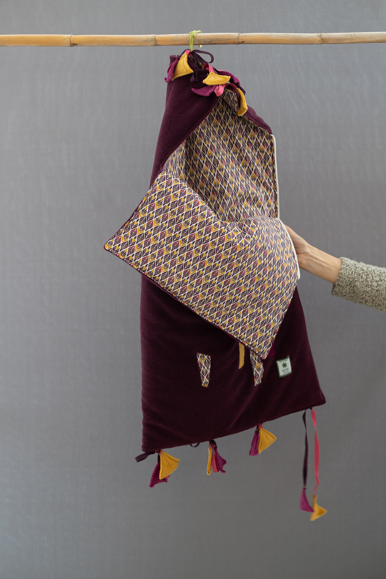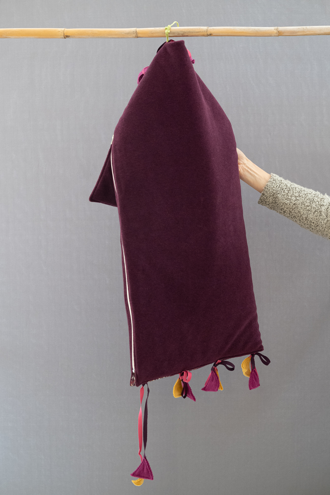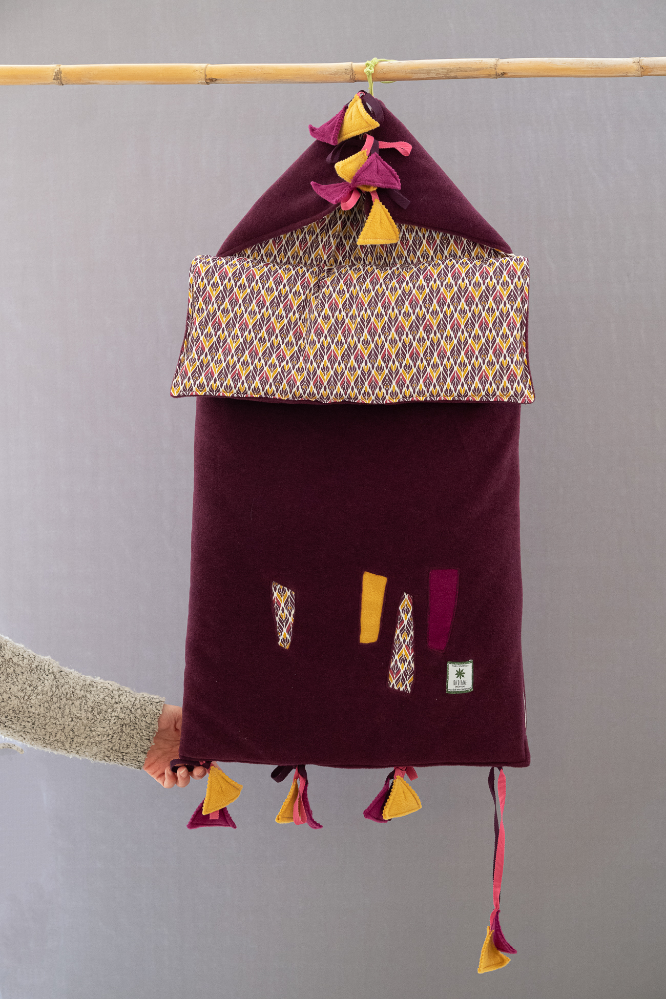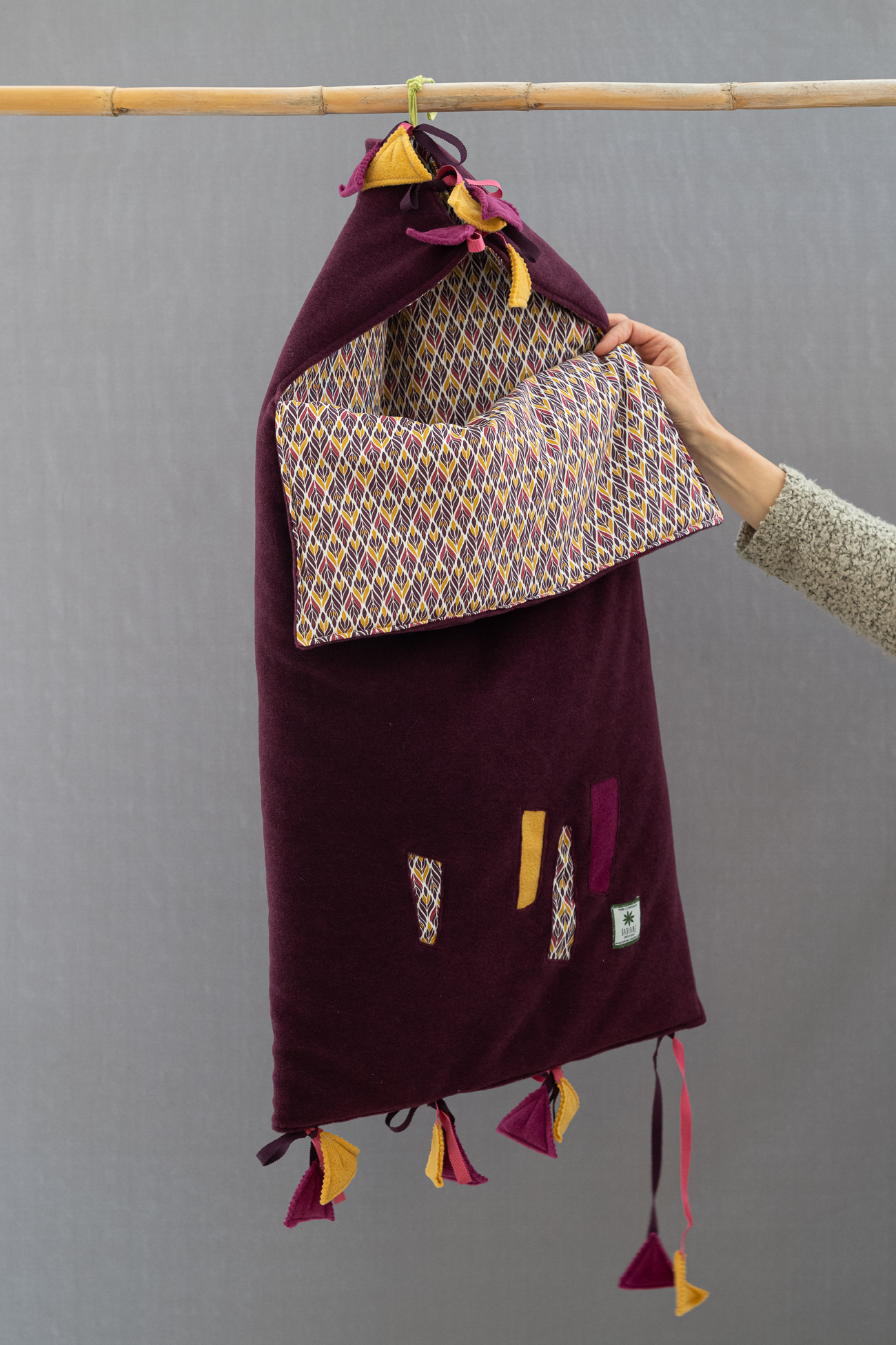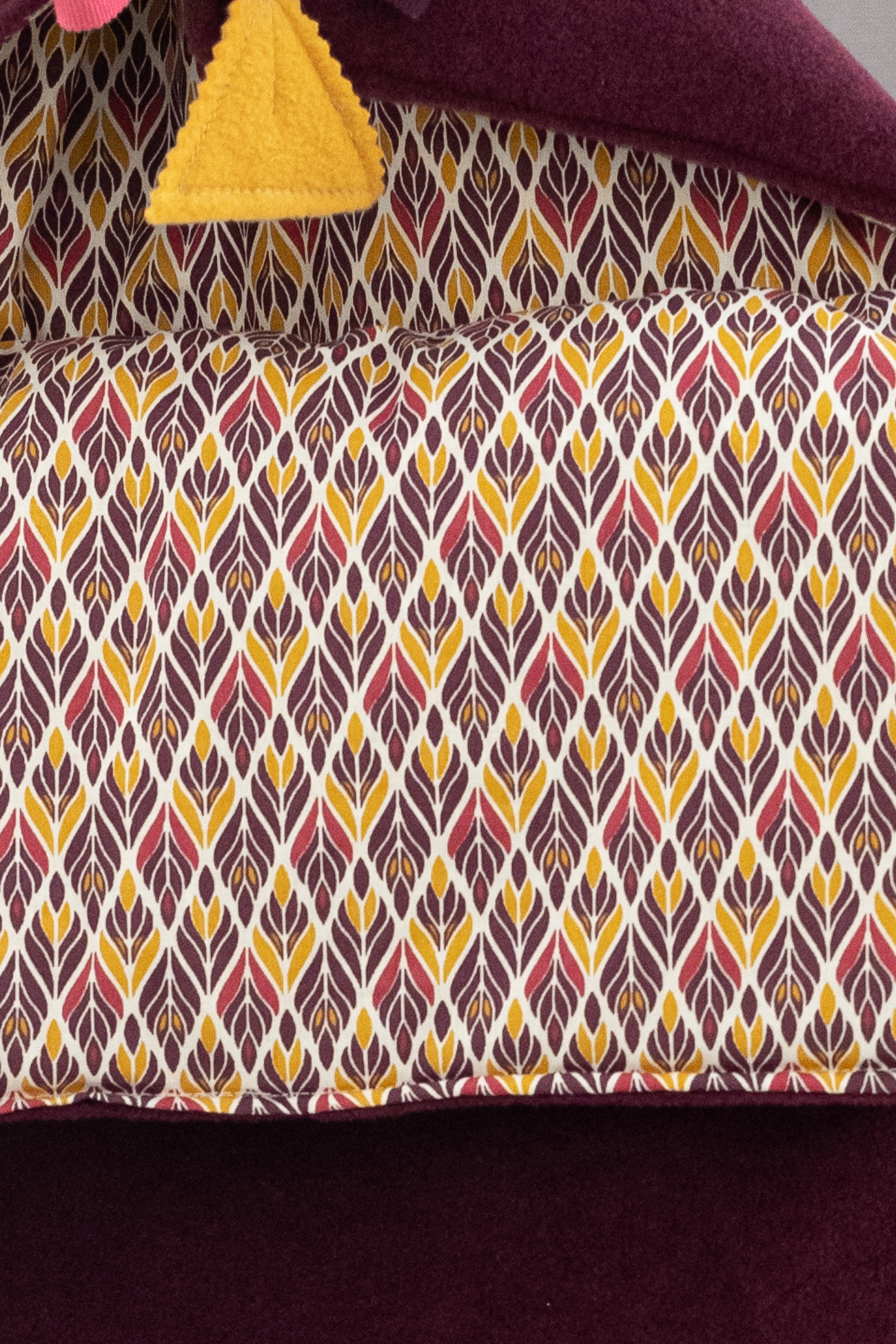 Ici, extérieur polaire chinée prune motifs incrustés en tissu imprimé et polaire, ouate et intérieur tissu imprimé graphique prune, fushia, jaune …sur fond blanc. Nouettes prune et rose.