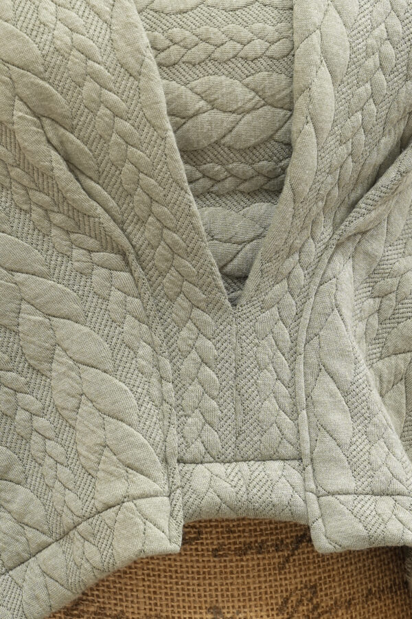 Ici, en tissu torsades kaki clair. Très chaud et confortable. Pull court, avec deux plis creux sur le devant et, plus long derrière pour un joli tombé et une forme originale. Grand col qui se porte destructuré ou retourné.