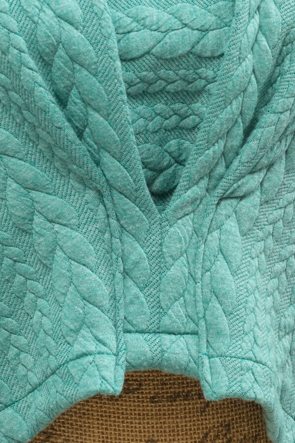 Ici, en tissu torsades bleu canard. Très chaud et confortable. Pull court, avec deux plis creux sur le devant et, plus long derrière pour un joli tombé et une forme originale. Grand col qui se porte destructuré ou retourné.