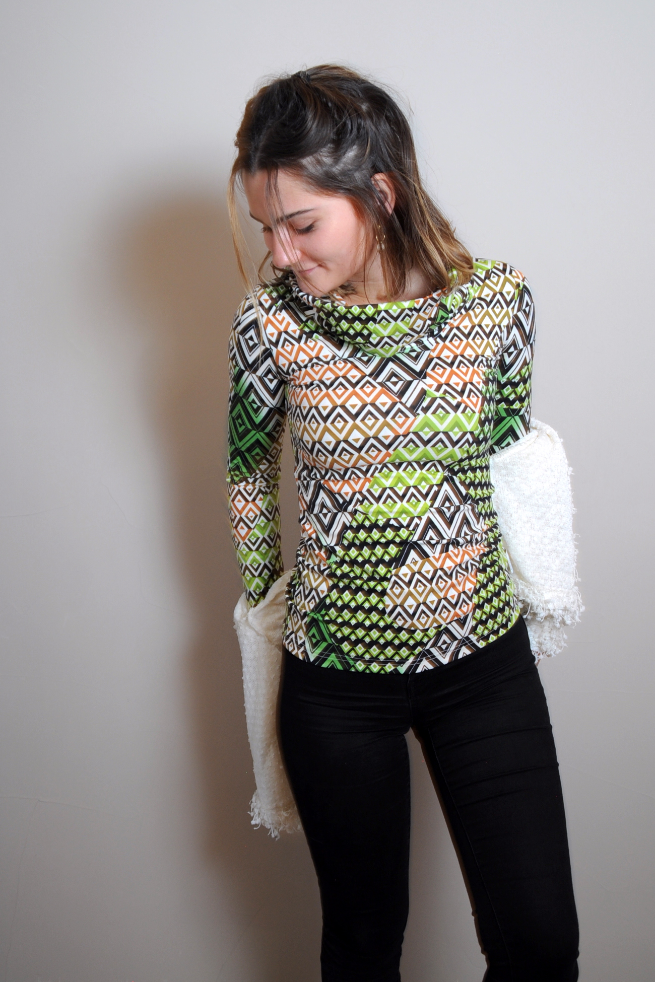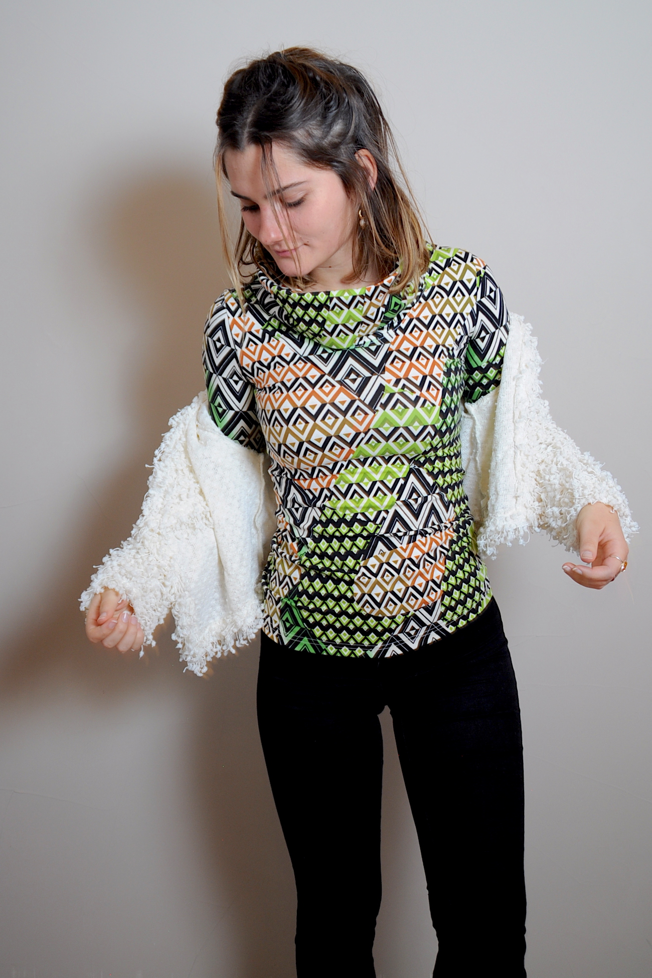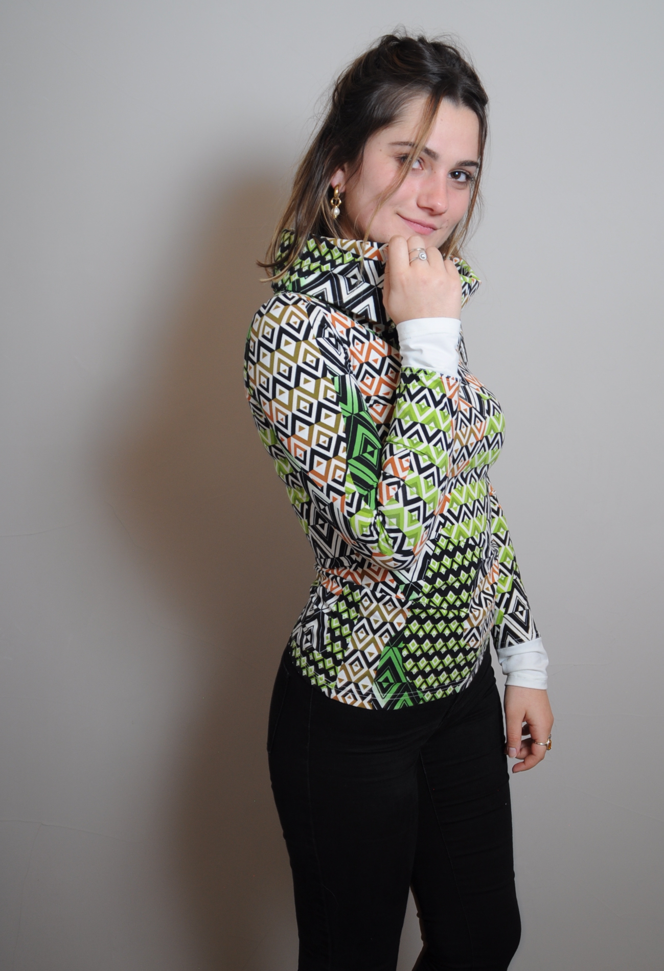 Top manches longues ajusté en tissu jersey imprimé graphique vert, anis, noir et blanc…avec les bas de manches unies et un col retombant.