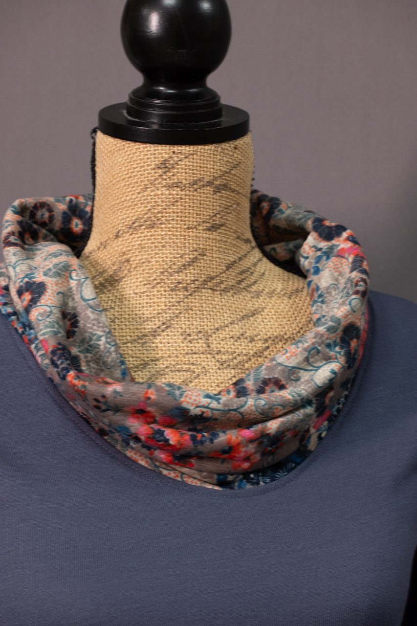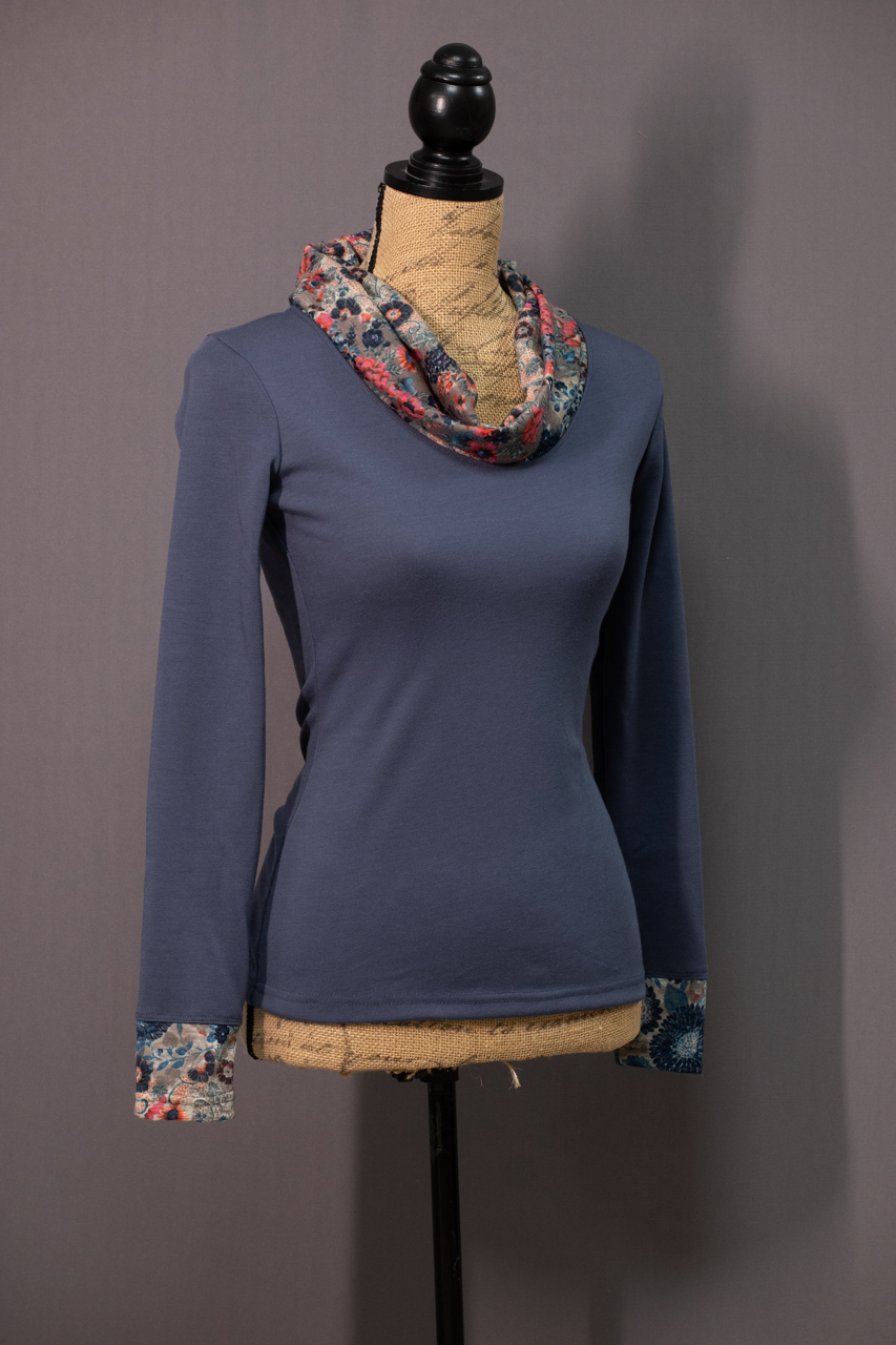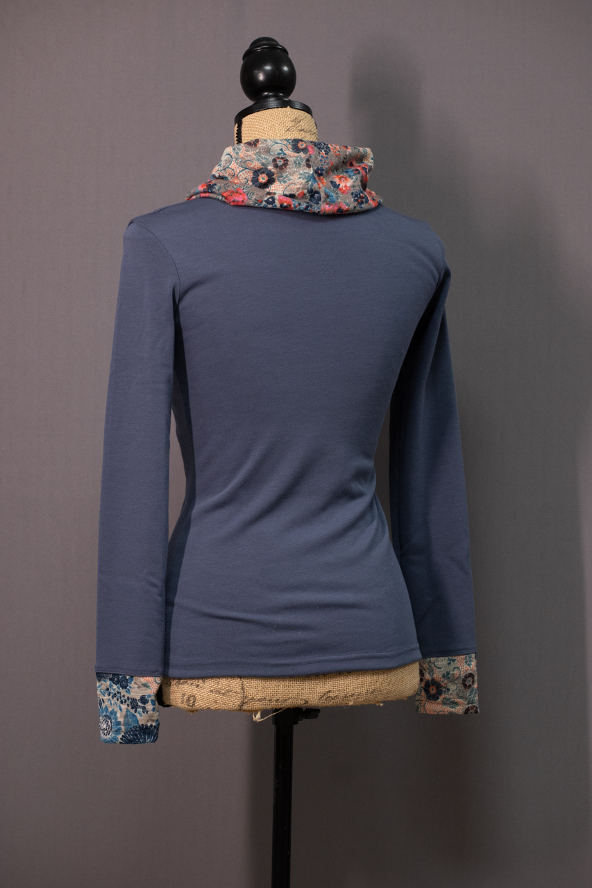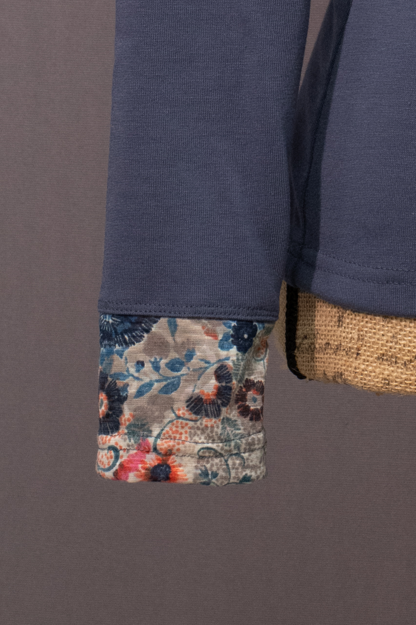Top manches longues ajustée en tissu jersey uni bleu avec les bas de manches et un col retombant en jersey imprimé fleuri marine, corail, beige…