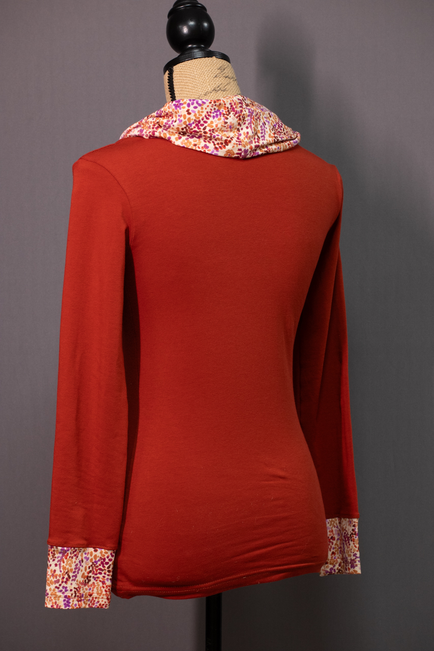 Top manches longues ajustée en tissu jersey uni brique avec les bas de manches et un col retombant en jersey imprimé plumetis…