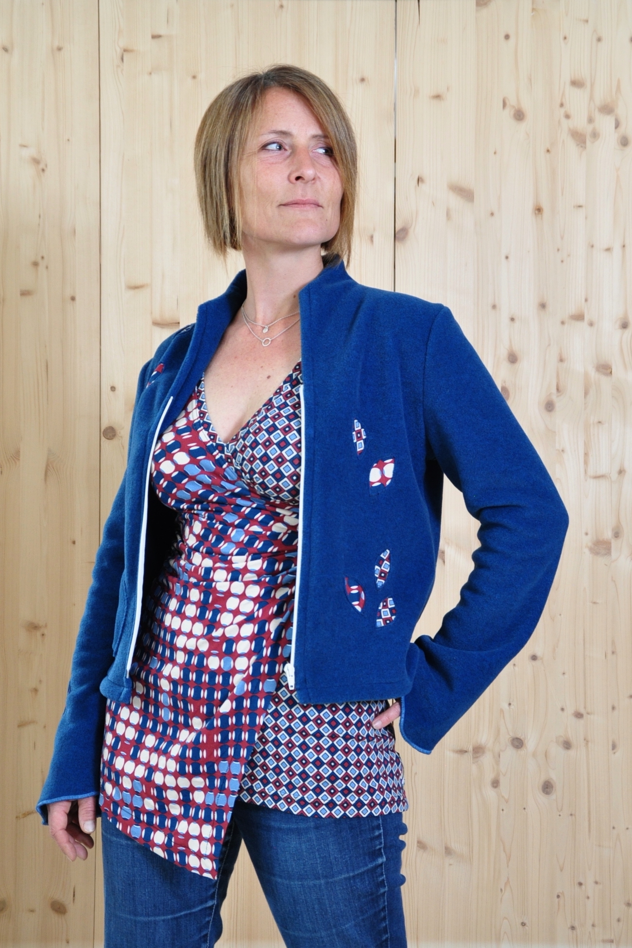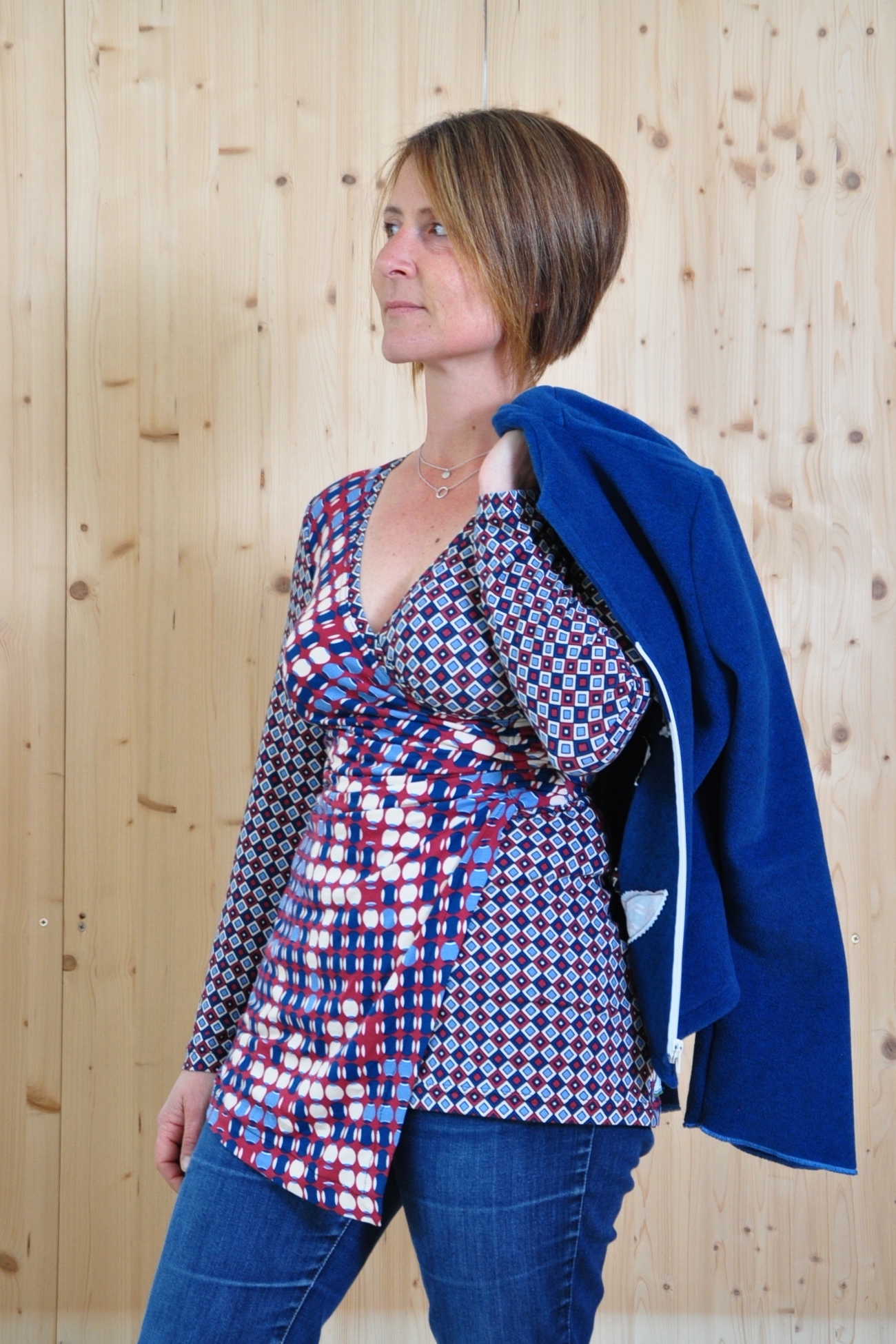 Tunique drapée manches longues, en tissu imprimé losange et ronds coordonnés rouge/bleu/marine et beige.
