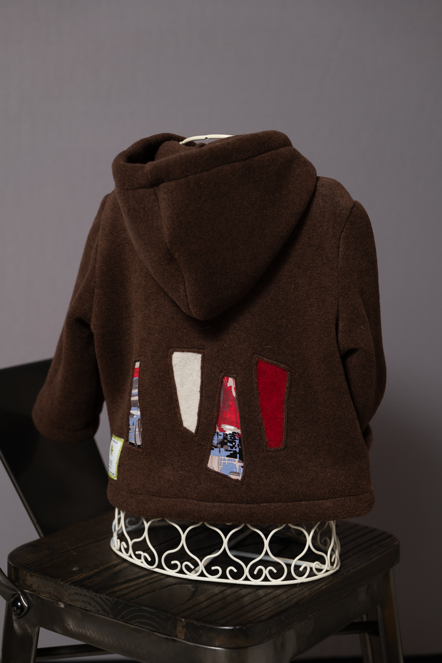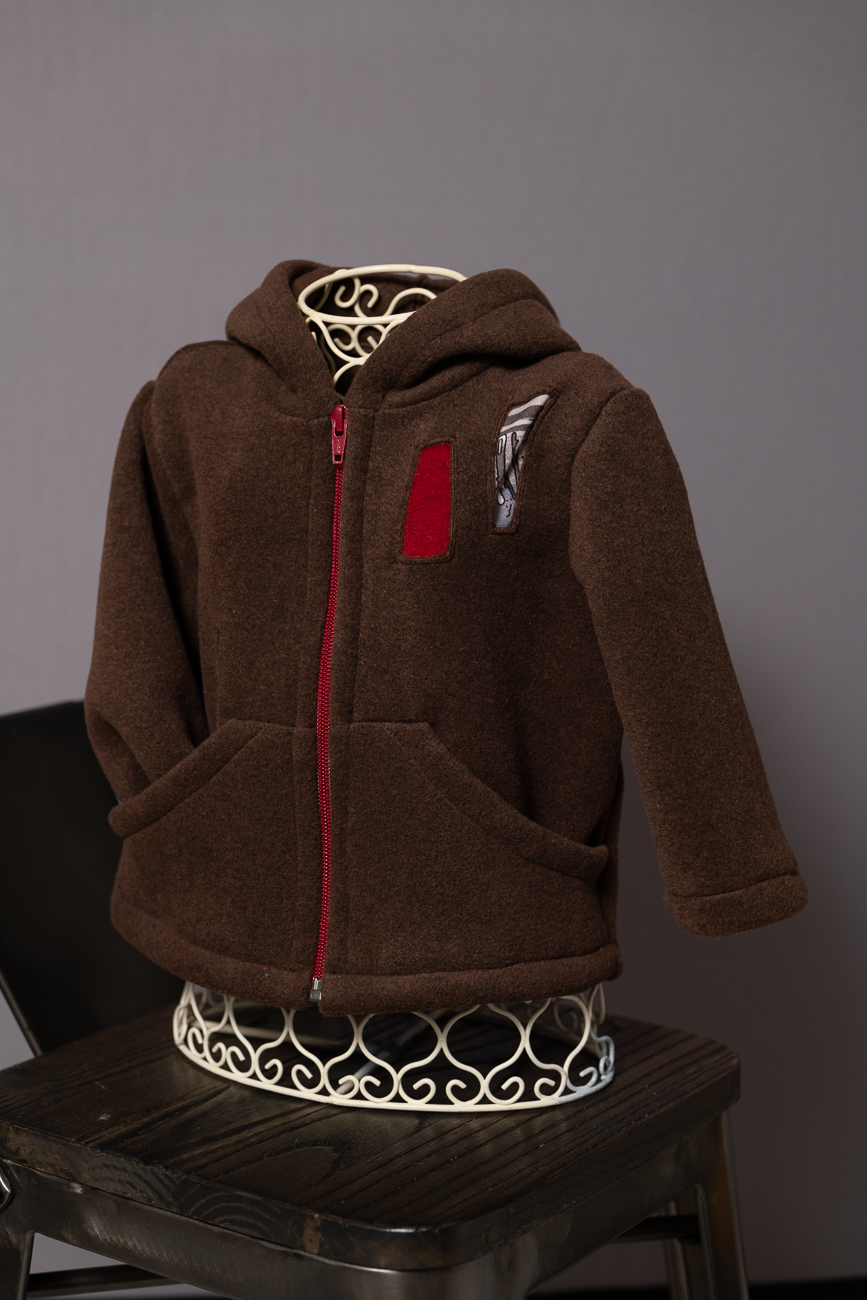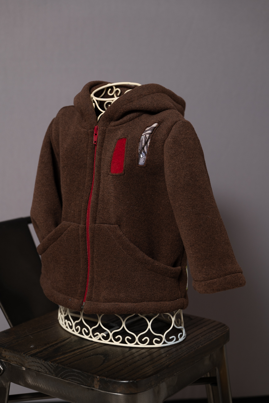 Ici, en polaire chocolat, zip rouge et motifs incrustées en polaire écrue, rouge et tissus imprimés dans le dos et sur le devant.